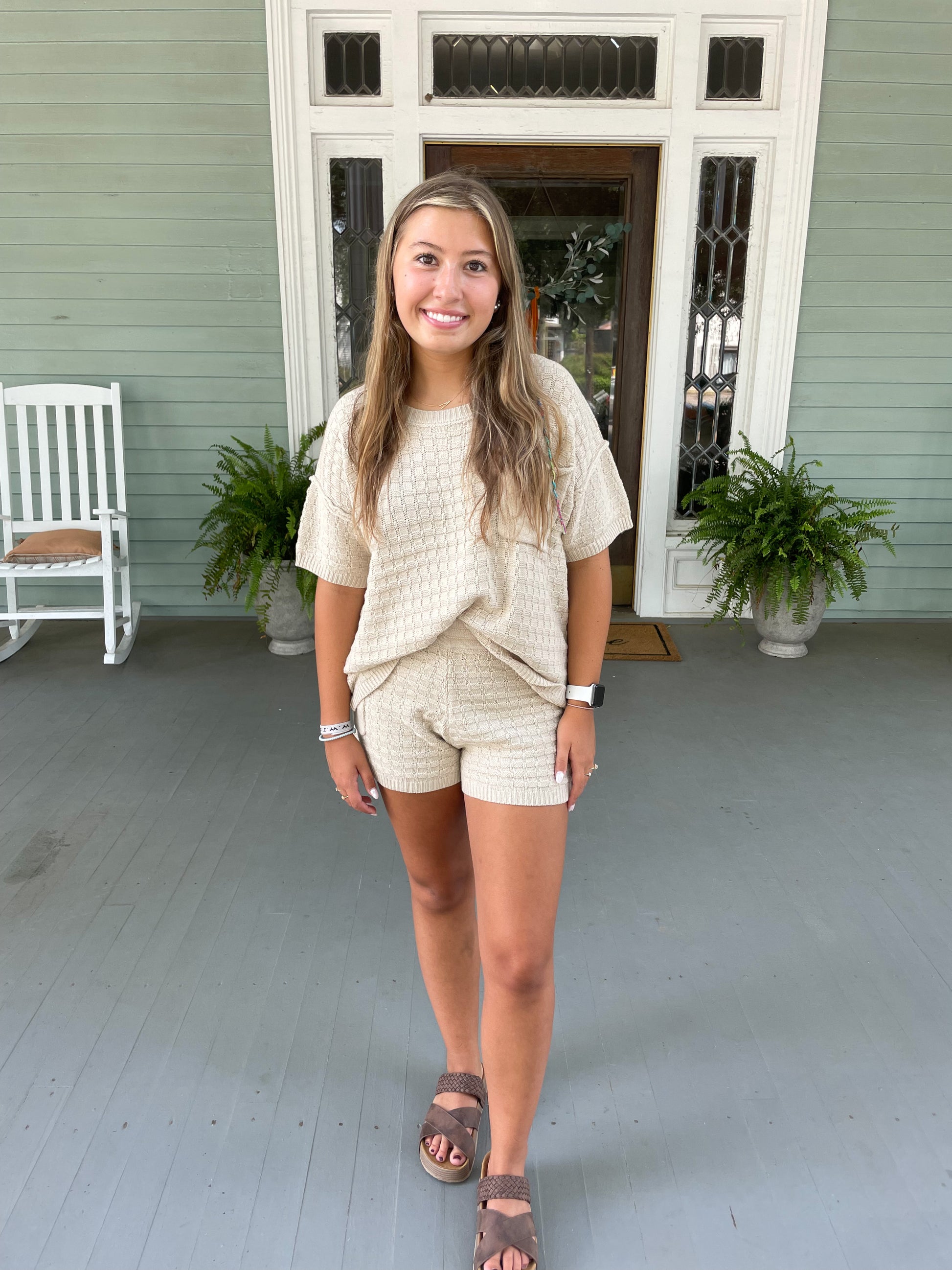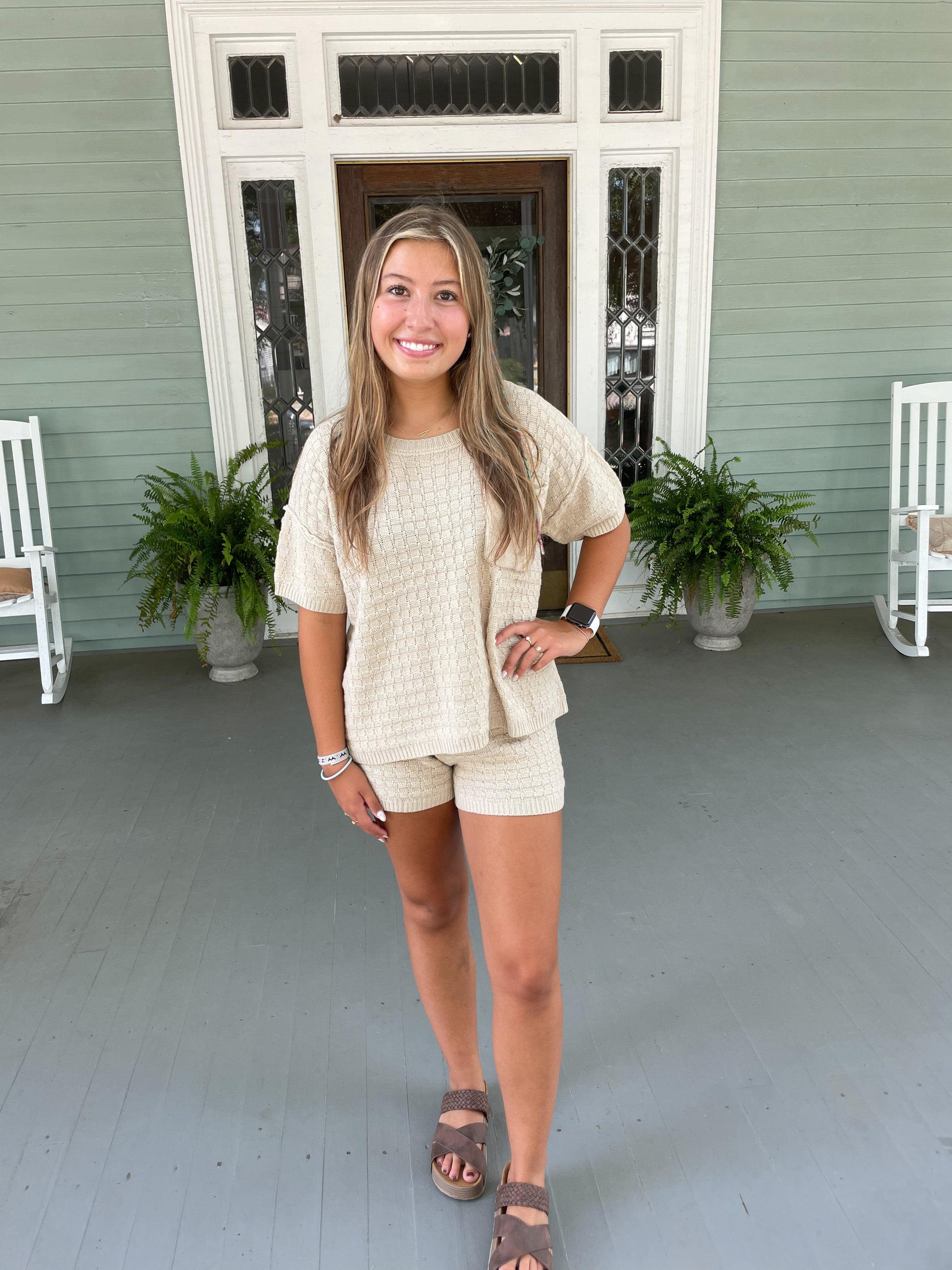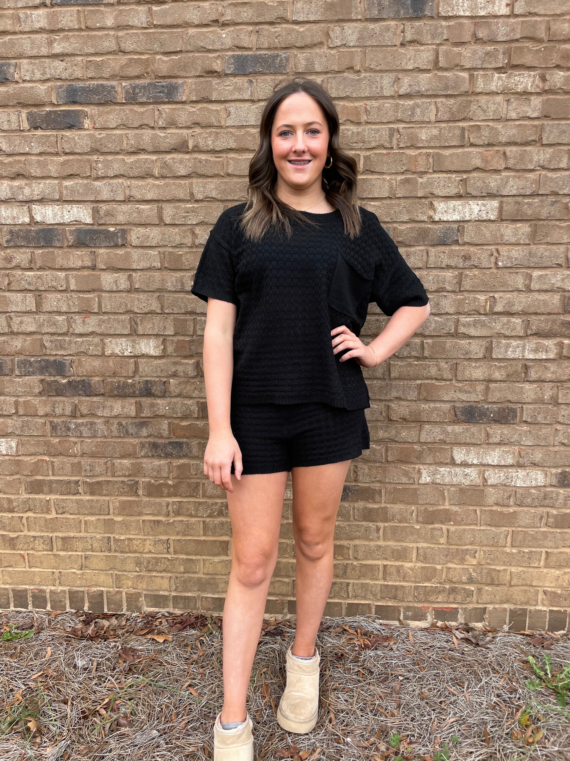 Oversized round neck sweater top with elastic waist shorts and pockets